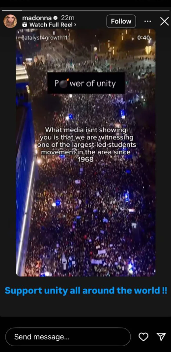 Na svom zvaničnom Instagram profilu, svetska pop diva Madonna podržala je srpske studente. U objavi ‘Power of unity’ iliti ‘Snaga jedinstva’ koju je podelila na svom storiju, prikazano je hiljade studenata u Novom Sadu koji su proteklog vikenda još jednom pokazali da mir i sloga mogu mnogo da promene u ovoj zemlji